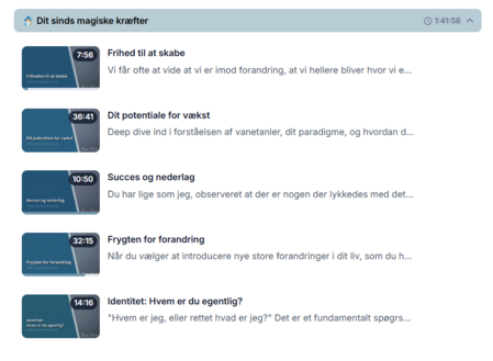Når du har gennemført købet, får du adgang til velkomst, E-bøger, modulet med dit kraftfulde sind og den først af de daglige videoer med det samme.
